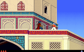 If you read up until now and thought you’re lucky there’s no time limit in the sequel, you were gravely wrong. You can take your time only when passing the first three levels. The evil Vizier Jaffar curses the princess with an illness and you’ll have only 75 minutes to reach the Grand Palace and save her from the clutches of death. Sometimes when you die or clear a level, an image of a tree with fading leaves appears. It shows the princess’ remaining life, but it’s not really important. If you do everything right and load again each time you die (not restart), you’ll have 20-30 minutes to spare when you’ll reach the ending.
